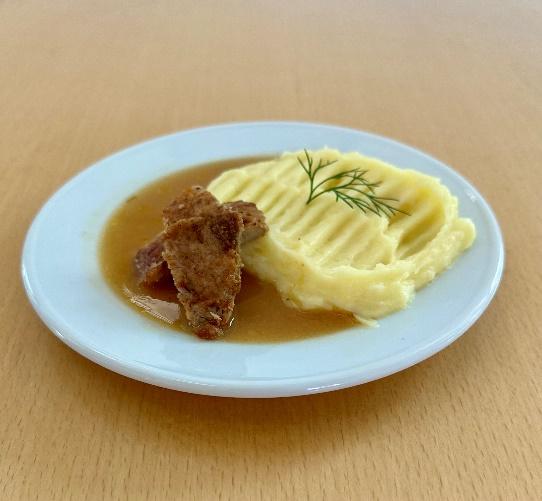 Úvod > Školní jídelna > Větrovský receptář > Obědy > Vepřový plátek v jemné lahodné omáčce s bramborovou kaší